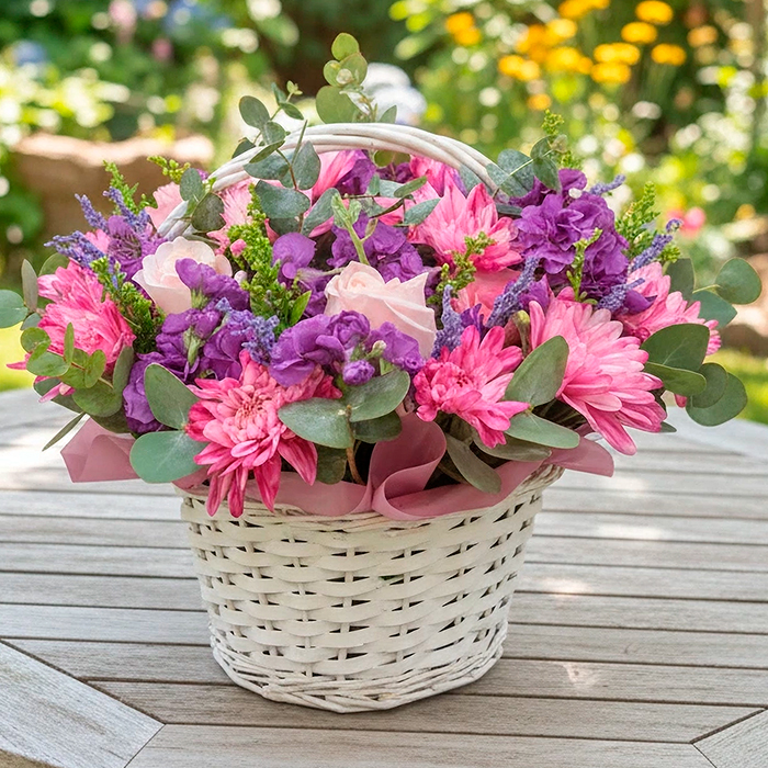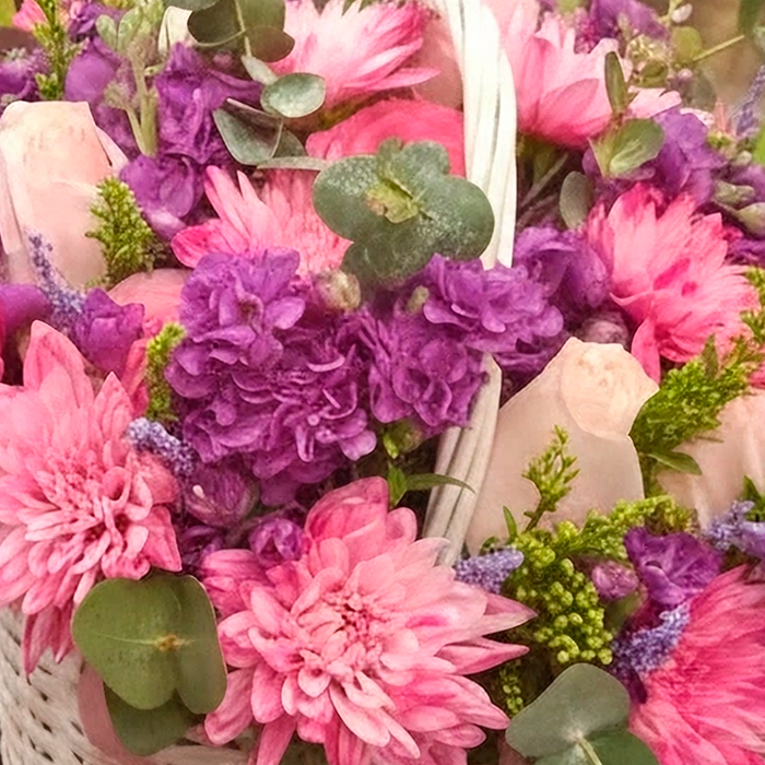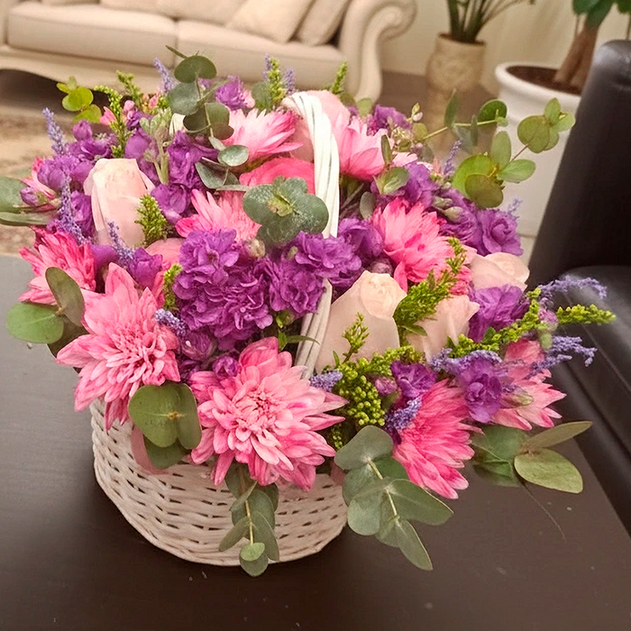 Роза одноголовая — 9 шт., Маттиола кустовая — 4 шт., Папоротник — 2 шт., Хризантема кустовая — 7 шт., Оазис, Корзина плетенная